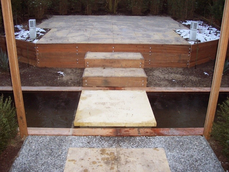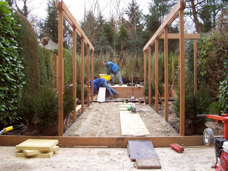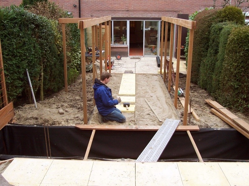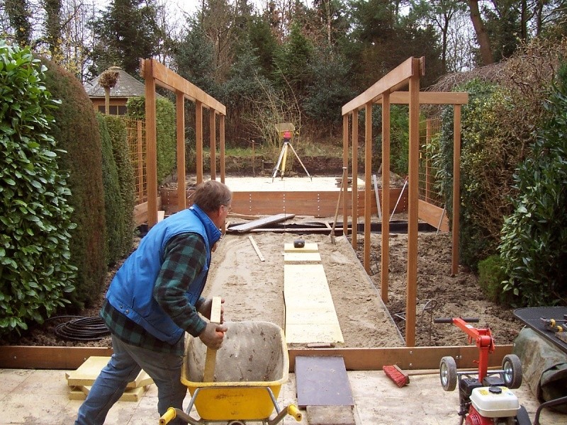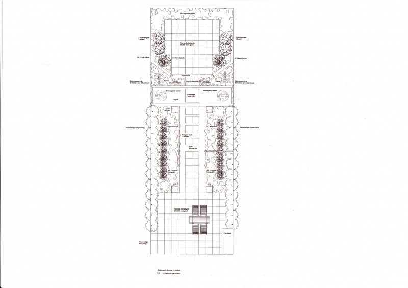 Door toepassing van een zichtlijn, versterkt door een pergola, hebben wij diepte aan de tuin gegeven richting 2e terras. Dit is te bereiken door over een tegel te lopen, die als het ware in de vijver ligt. en via een trap.