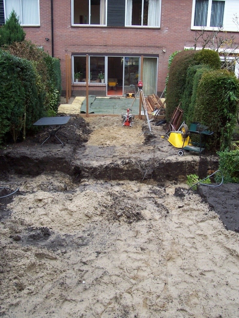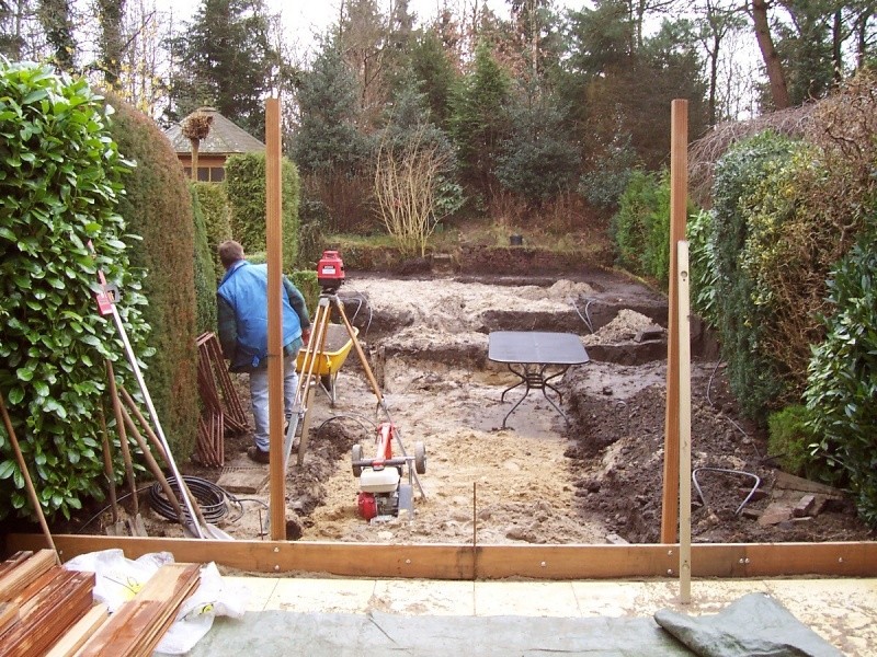 Dit is een tuin in de Bijvanck van Blaricum, men wilde graag 2 terrassen, iets met water, privacy, een adequate oplossing voor de 80cm hogere ligging van het laatste stuk van de tuin en absuluut geen gras.